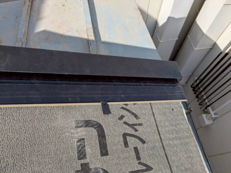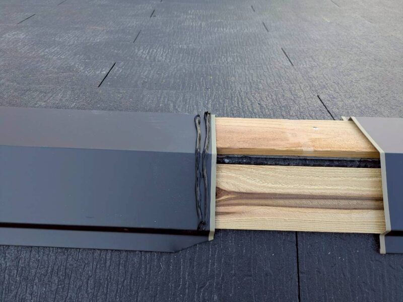 棟の板金を取り付けて行きます。この際、補強としてコーキングを塗り込んでいきます。