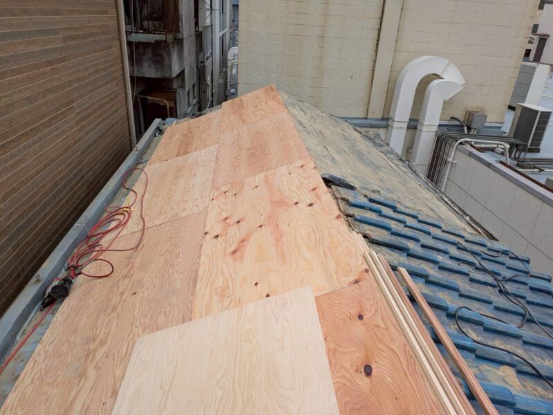 瓦と土を撤去したのち、コンパネを敷き詰めて行きます。