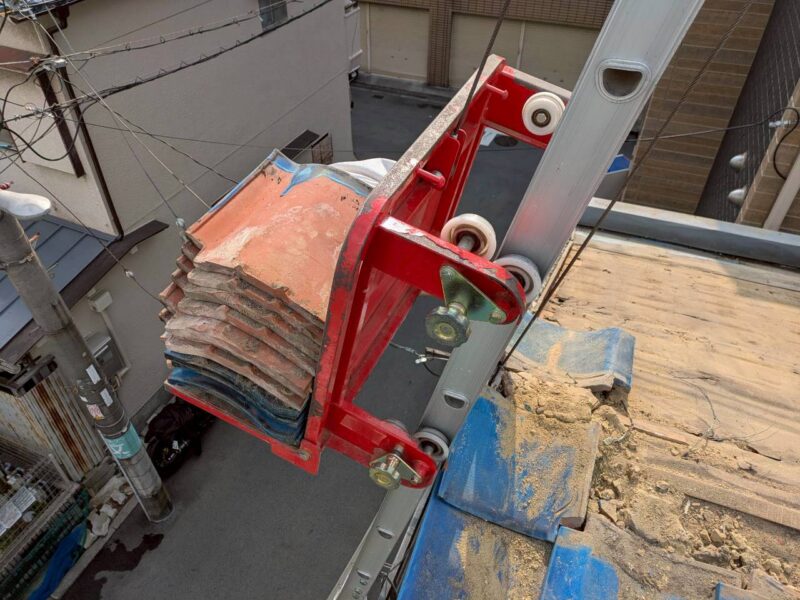 専用のウィンチにて瓦を下ろして行きます。
